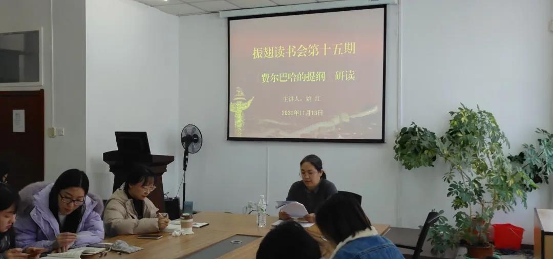 本网讯(通讯员 刘冰婕)2021年11月13日9:30,公司第十五期“振翅”读书会如期举行,读书会由公司姚红老师主持、主讲,全体2021级研究生参与了此次活动。本期活动以《关于费尔巴哈的提纲》经典著作为研读内容。《关于费尔巴哈的提纲》是马克思在1845年写的笔记,恩格斯称它为“包含着新世界观的天才萌芽的第一个文件”。习近平强调:共产党人要把读马克思主义经典、悟马克思主义原理当作一种生活习惯和精神追求。