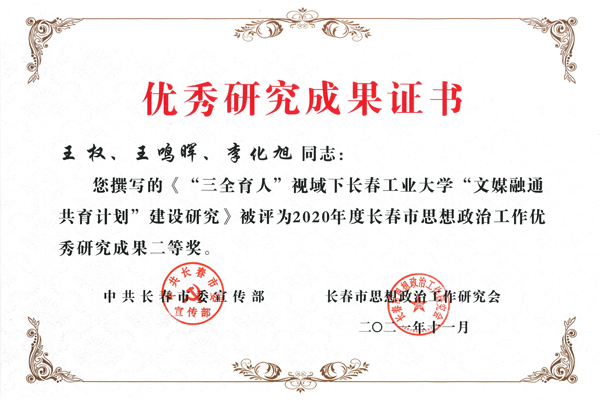 本网讯(通讯员 李化旭)近日,中共长春市委宣传部、长春市思想政治工作研究会下发《关于表彰2020年度长春市思想政治工作优秀研究单位和优秀研究成果的决定》,由马克思主义公司党委副书记王权主持撰写的《“三全育人”视域下388vip太阳集团“文媒融通共育计划”建设研究》荣获二等奖。