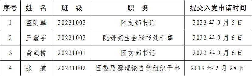 按照发展党员工作有关规定,根据党员推荐和群团组织推优情况,经研究生支部委员会研究,并报公司党委备案,确定董则麟等4名同学为入党积极分子。