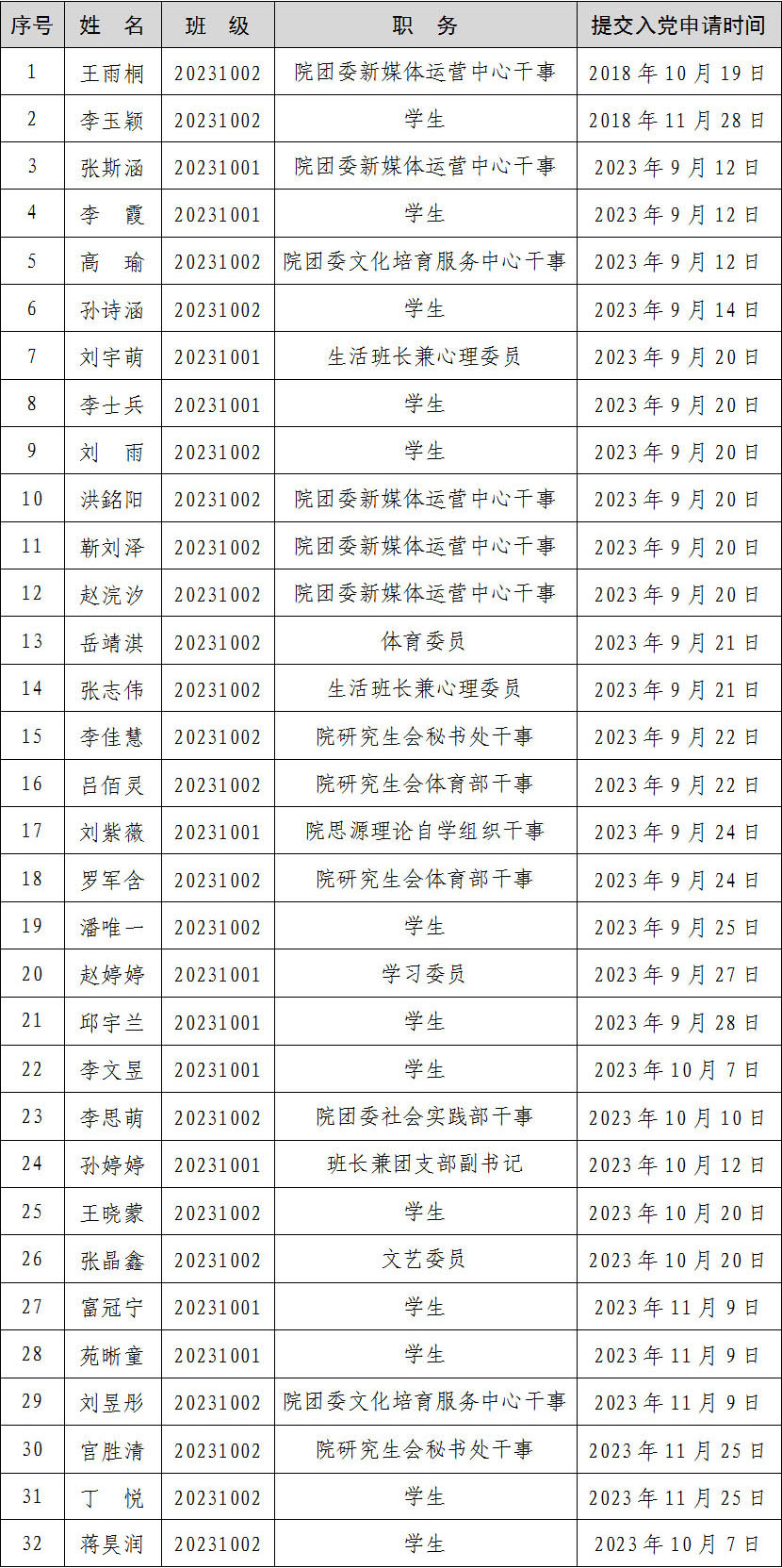 按照发展党员工作有关规定,根据党员推荐和群团组织推优情况,经研究生支部委员会研究,并报公司党委备案,确定王雨桐等32名同学为入党积极分子。