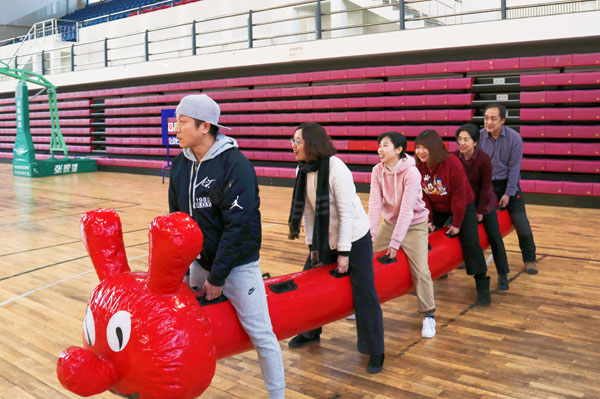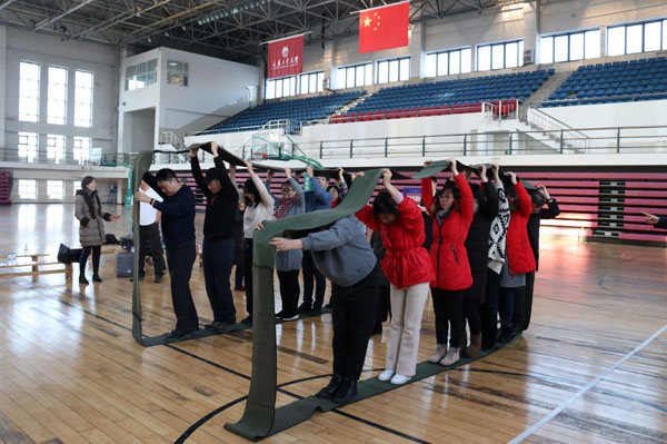 此次素质拓展活动共设置了“步步为营”“车轮滚滚”“穿越丛林”“跳小绳”“俄罗斯方块”“毛毛虫竞速”等6个娱乐竞技项目。全院教工经过赛前抽签分成5组,由公司班子成员分别带队,与研究生队同场竞技。