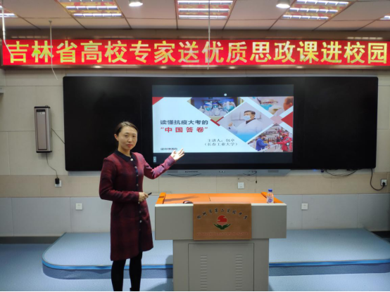 11月27日上午,形策教研室包卓老师走进榆树市第二实验中学,为5000余名师生讲授了一堂以《读懂抗疫大考的“中国答卷”》为题的思政课。在40分钟的课程里,她通过视频短片、PPT演示、事例讲解、数据分析、现场问答互动等形式,完成了这堂特殊的思政课,受到师生广泛好评。