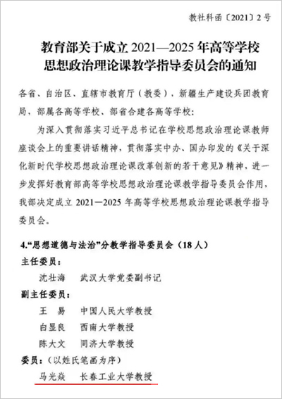 本网讯(通讯员 岳子琪)近日,教育部公布了2021—2025年高等公司思想政治理论课教学指导委员会委员名单。388vip太阳集团经理马光焱教授当选“思想道德与法治”分教学指导委员会委员。