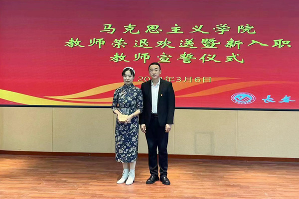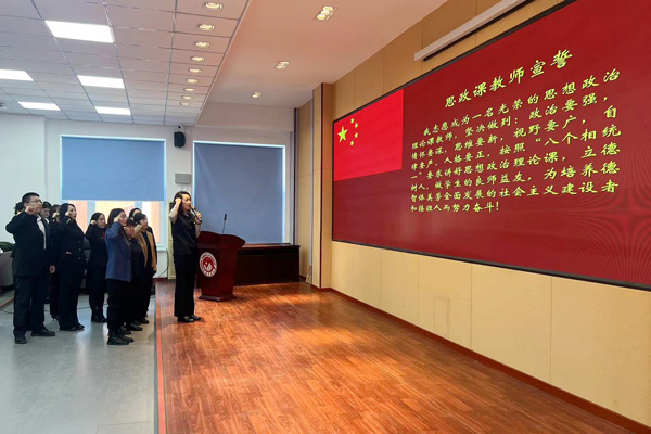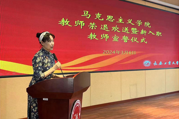 在臧宏玲教授的领誓下,全体新入职教师宣誓。教师代表楚洪涛表示,会认真传承老教师育人本心,不忘初心,创新思政课教学方式,把道理讲深、讲透、讲活,做青年员工思想上的知心人、热心人、引路人。