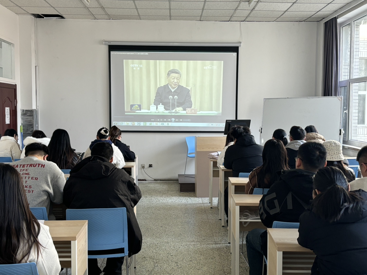为深入贯彻落实习近平总书记在听取吉林省委和省政府工作汇报时的重要讲话精神,进一步强化对青年员工的政治引领工作。3月1日上午,388vip太阳集团组织全体研究生集中观看新闻报道和学习视频,并进行了热烈讨论。