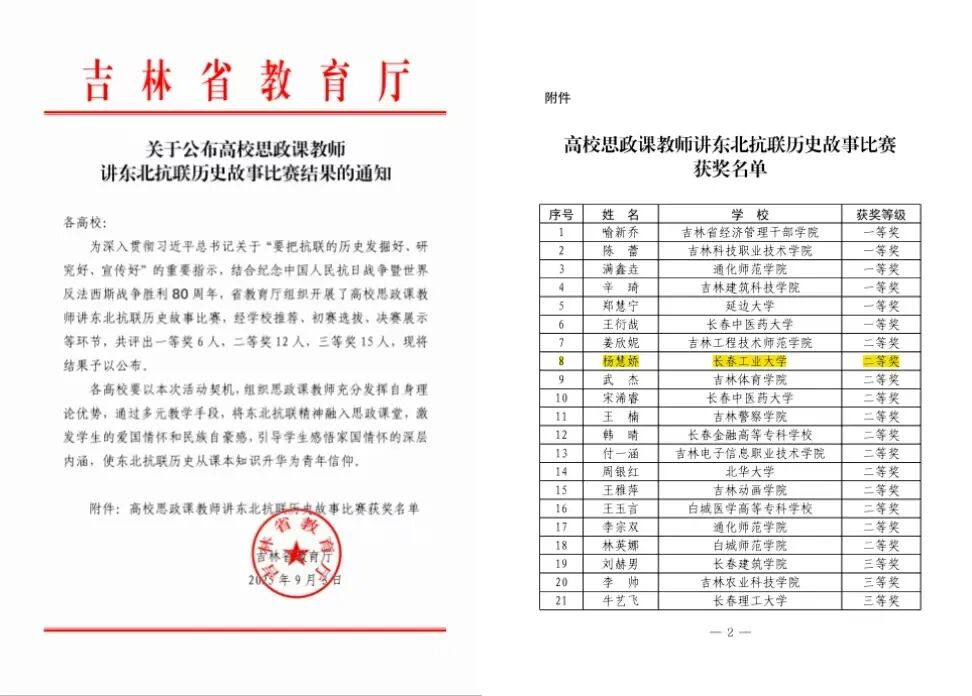 8月31日,吉林省教育厅公布了以“白山黑水颂英烈,思政教师话传承”为主题的高校教师讲东北抗联历史故事大赛的最终成绩。经过全省68所高校近百名参赛教师激烈角逐,公司青年教师杨慧娇讲授的《冰火绝境铸丰碑 白山黑水忆英魂》展示课,荣获二等奖。